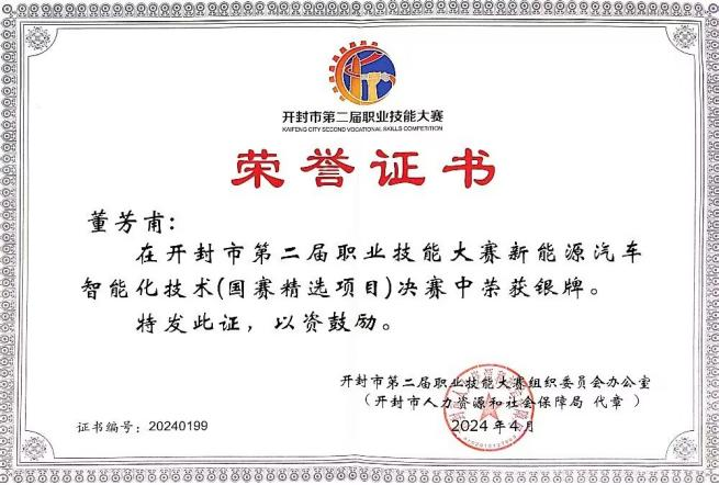 本次大赛由开封市人民政府主办,旨在全面检验和提升全市职业技能人才的专业素养和综合能力。在新能源汽车智能化技术项目的比赛中,我校参赛教师王亚楠、董芳甫展现出了高超的技能水平和出色的团队协作能力。他们凭借扎实的专业知识、精湛的操作技艺和冷静的应对能力,在比赛中脱颖而出,荣获银奖。这一成绩的取得,不仅是对我校参赛选手个人努力的肯定,更是对学校新能源汽车技术专业教育水平的认可。