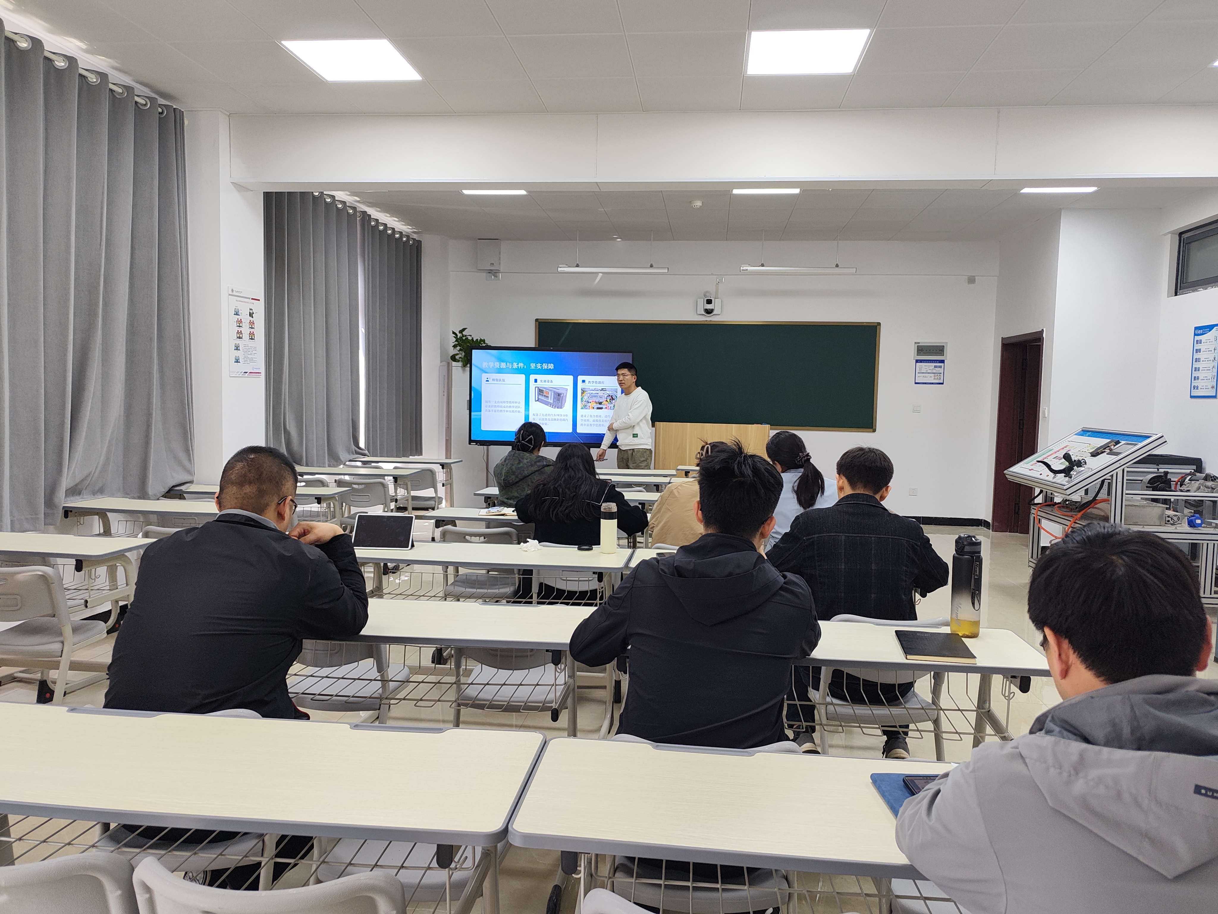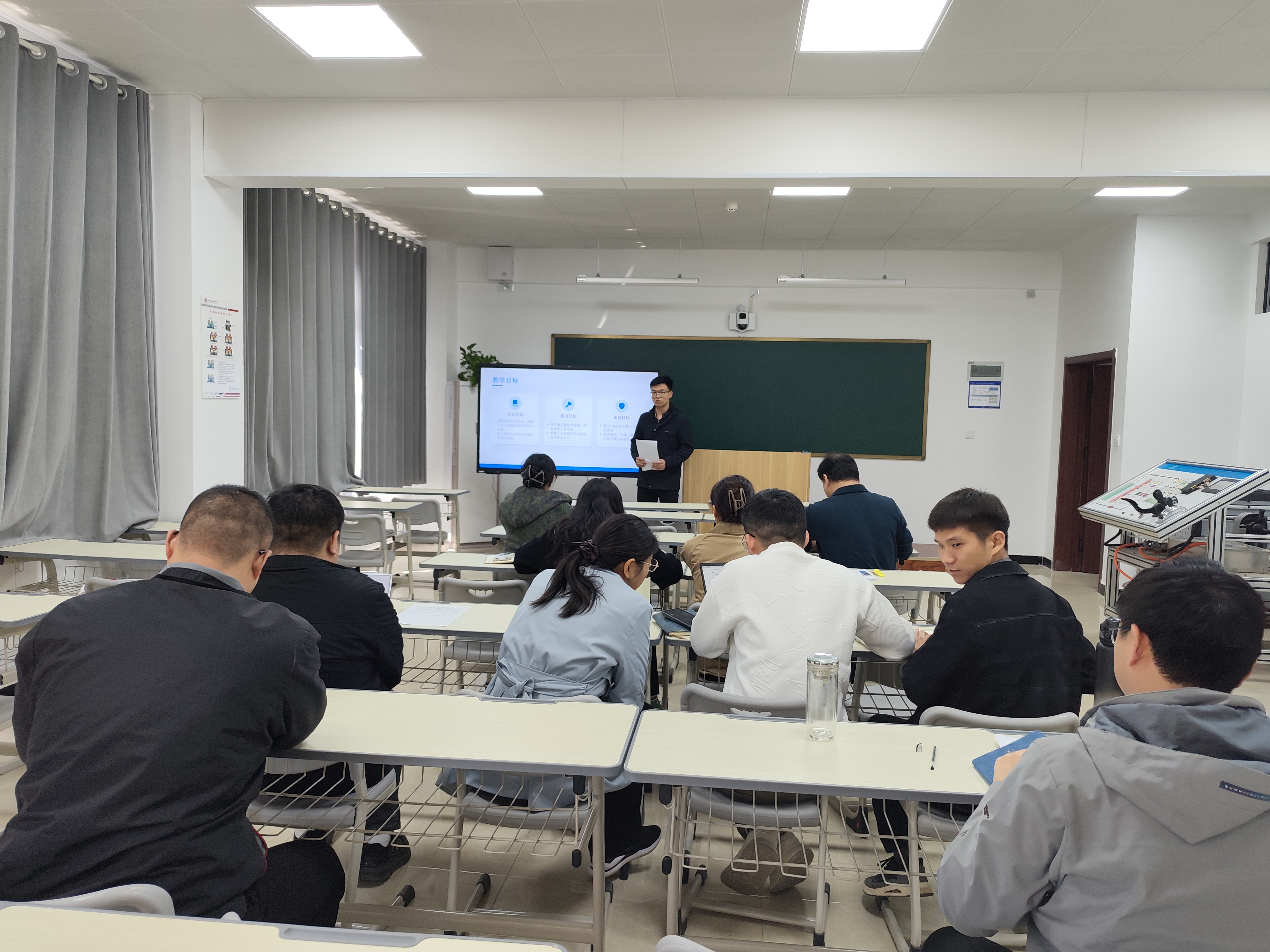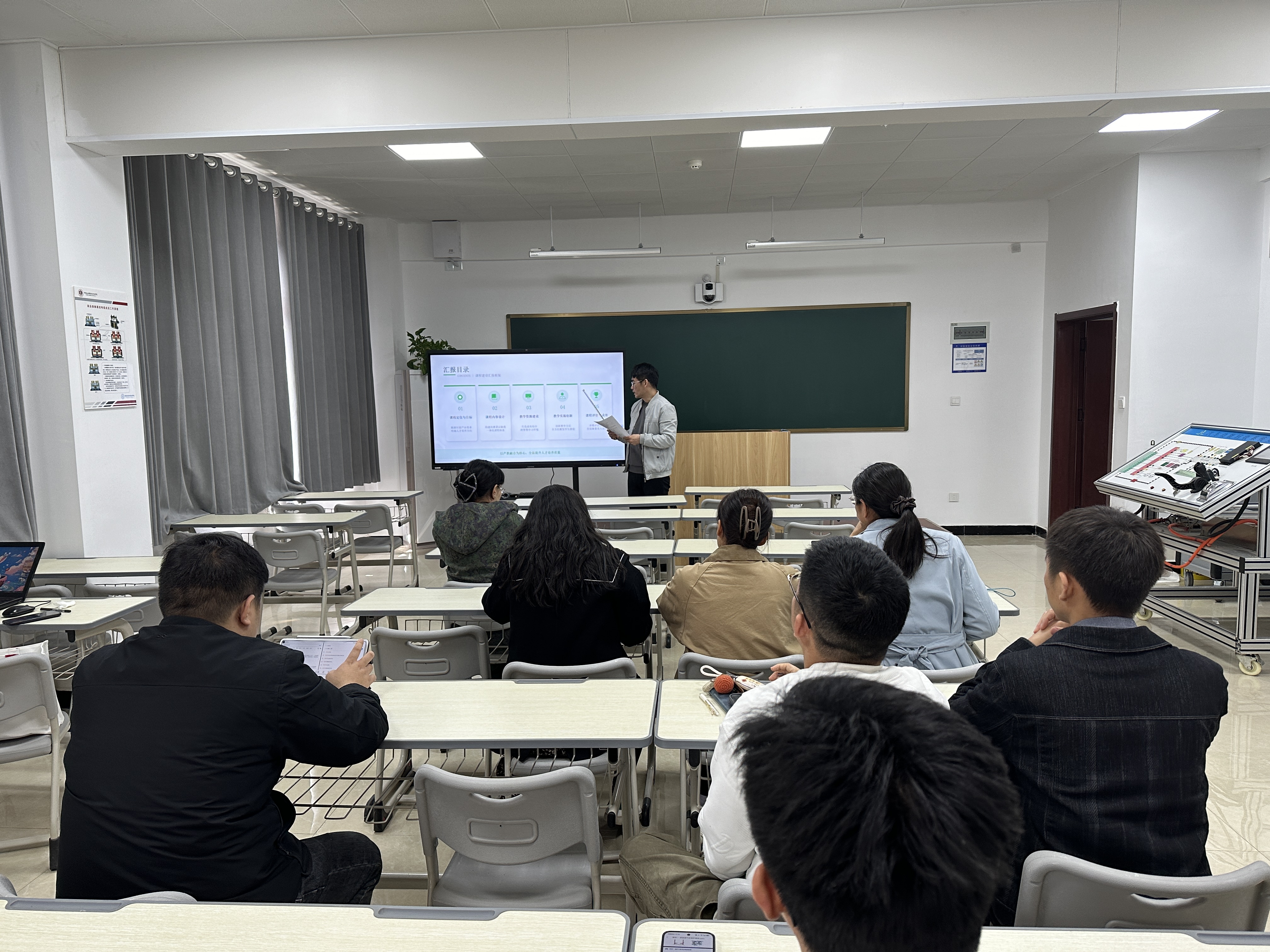 随后,各课程负责人依次进行“说课程”汇报,围绕课程定位与目标、内容设计、教学资源、实施创新及评价成效等方面进行15分钟陈述,并展示了课程大纲、课程标准等支撑材料。现场研讨氛围浓厚。