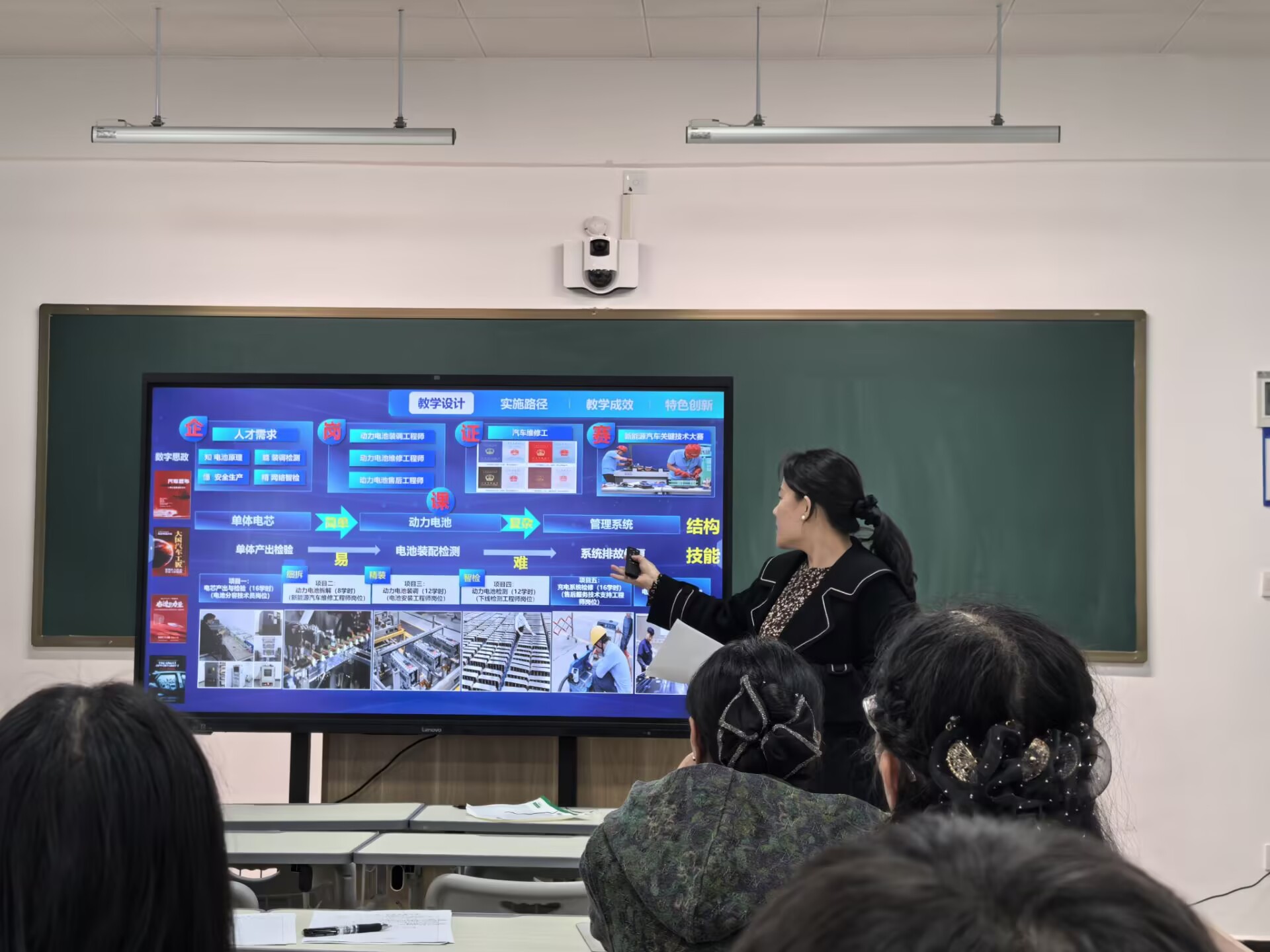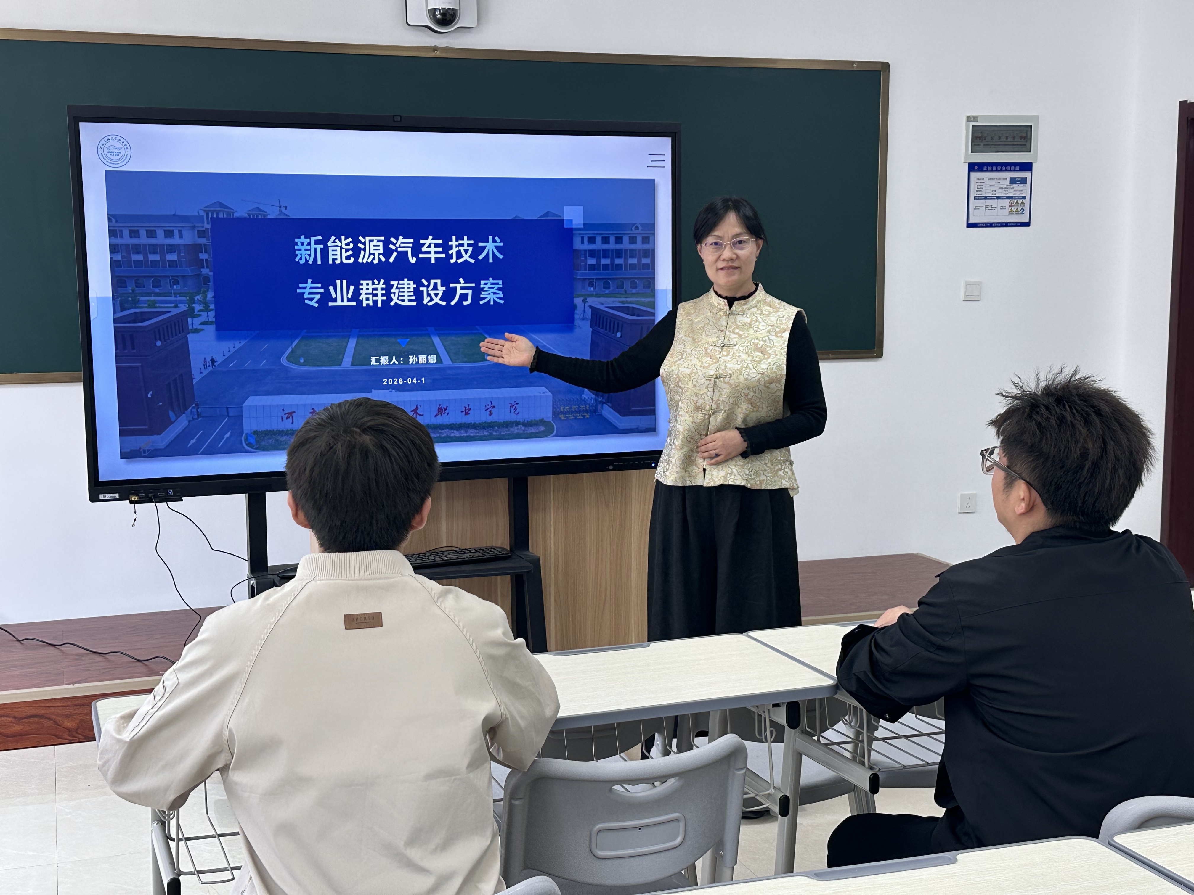 活动中,孙丽娜率先进行“说专业群”汇报。她从专业群的产业调研出发,阐述了新能源汽车技术专业群的服务面向与组群逻辑,重点介绍了专业快速反应机制的建设思路,包括产业需求调研机制、专业动态调整的流程与标准,以及学院层面在师资、实训、校企合作等方面的资源统筹规划。